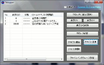 Telopperは設定画面で設定した文字列を設定時間、デスクトップウィンドウにテロップ表示をおこないます。 設定は、表示位置、文字サイズ、文字色、影の色、及び、表示時間が設定可能です。